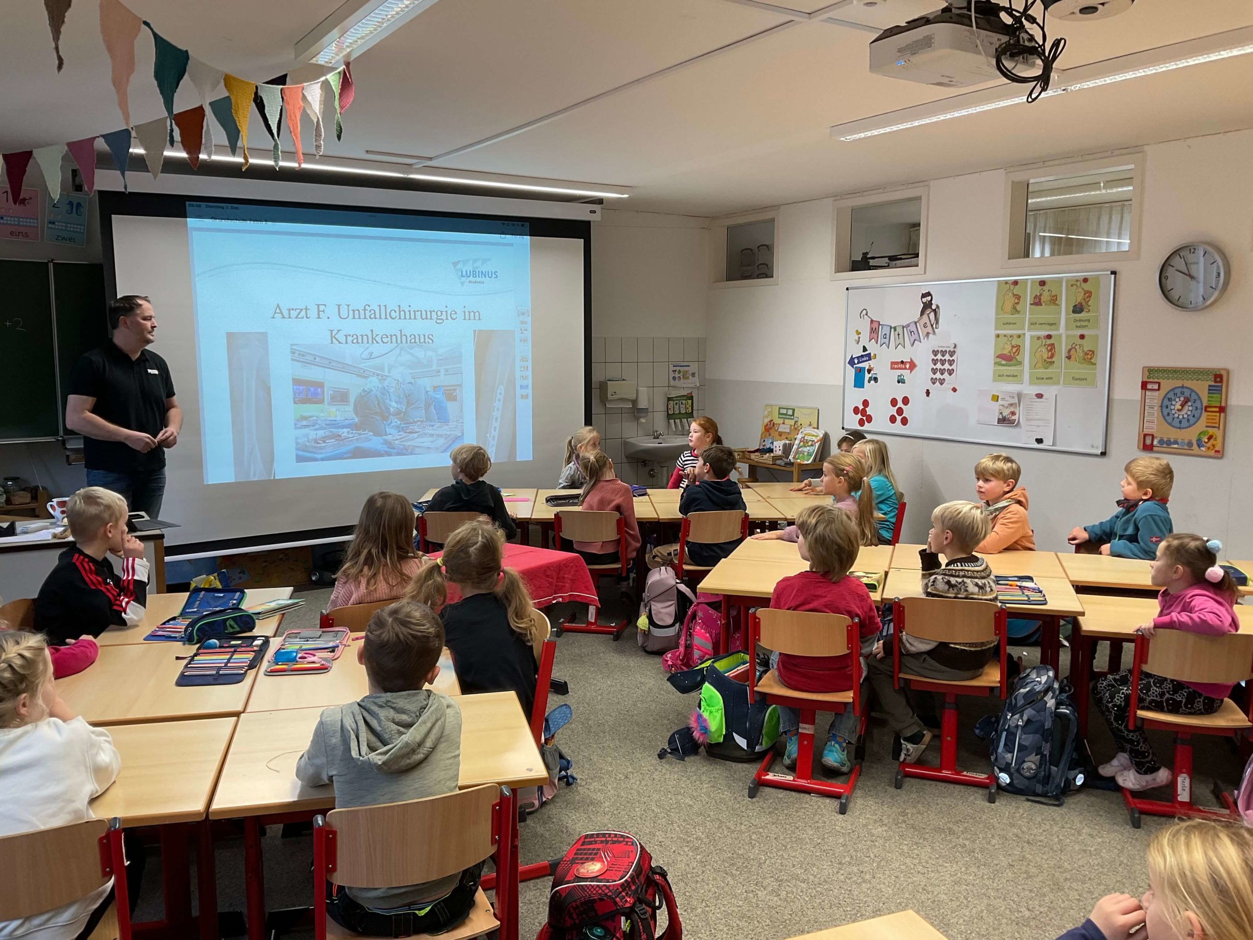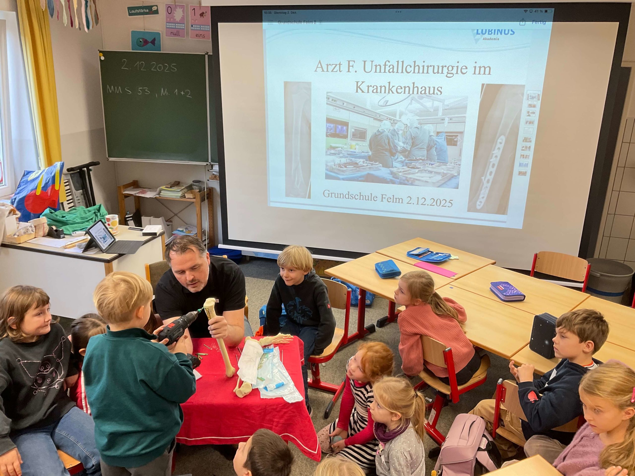 Am 2.12.2025 hatten die Schülerinnen und Schüler der Klasse 1 und 2 der Grundschule in Felm im Rahmen des Präventionsprogrammes Klasse 2000 Besuch von Herrn Dr. Volker Schengili. Herr Dr. Schengili stellte seinen Beruf des Unfallchirurgen vor. Er gab den Kindern Tipps für gesunde Ernährung als Prävention vor Knochenerkrankungen und Unfallfrakturen und demonstrierte wie er Unfallfrakturen reparieren kann. Außerdem gab Herr Dr. Schengili einen Einblick in seinen Lebenslauf und er berichtete, wie wichtig es ist, in seinem Beruf sich gut in Deutsch, Mathe und Sachunterricht auszukennen. Herzlichen Dank, lieber Herr Dr. Schengili, für die Zeit, die Sie sich für uns genommen haben!