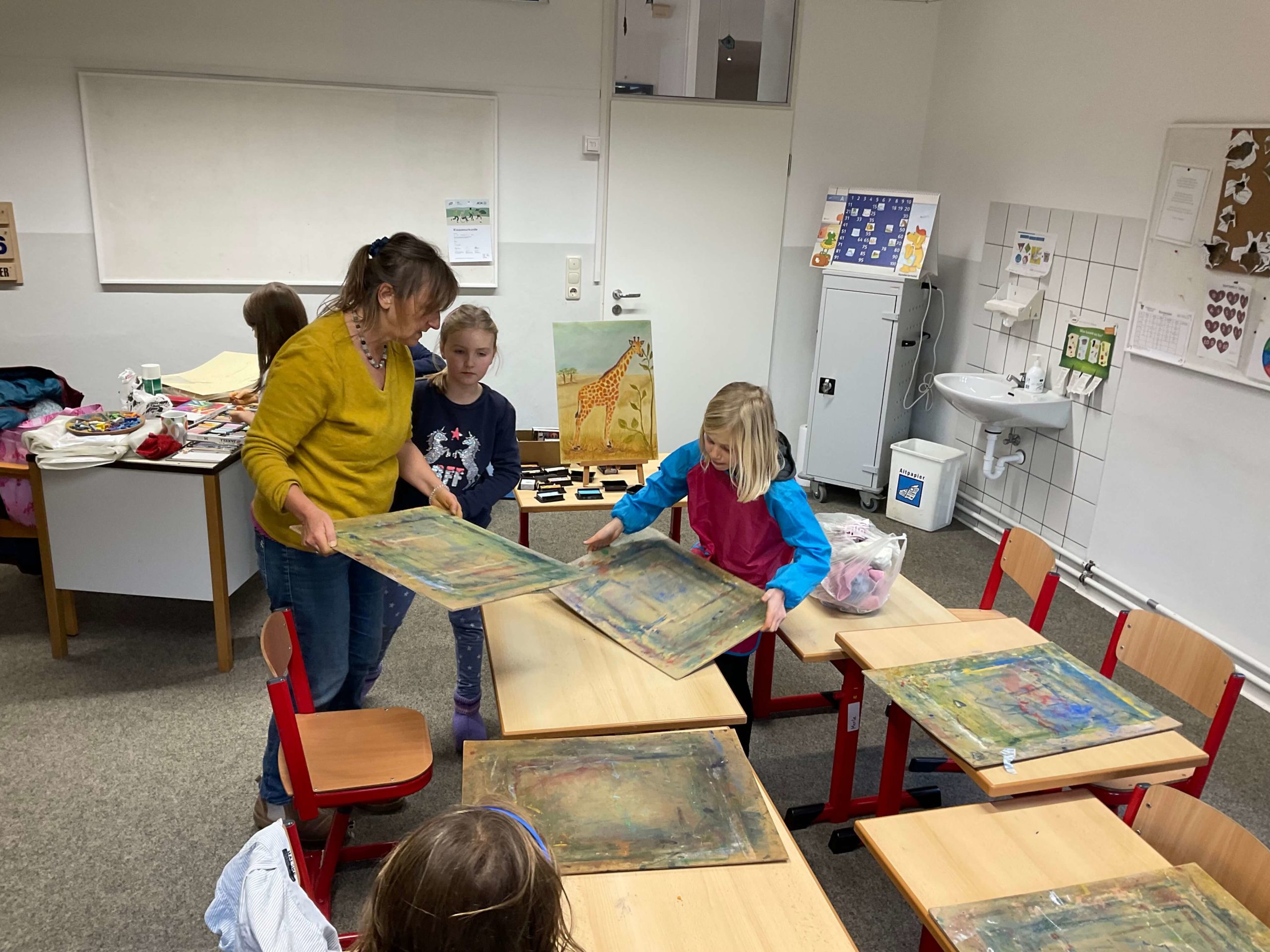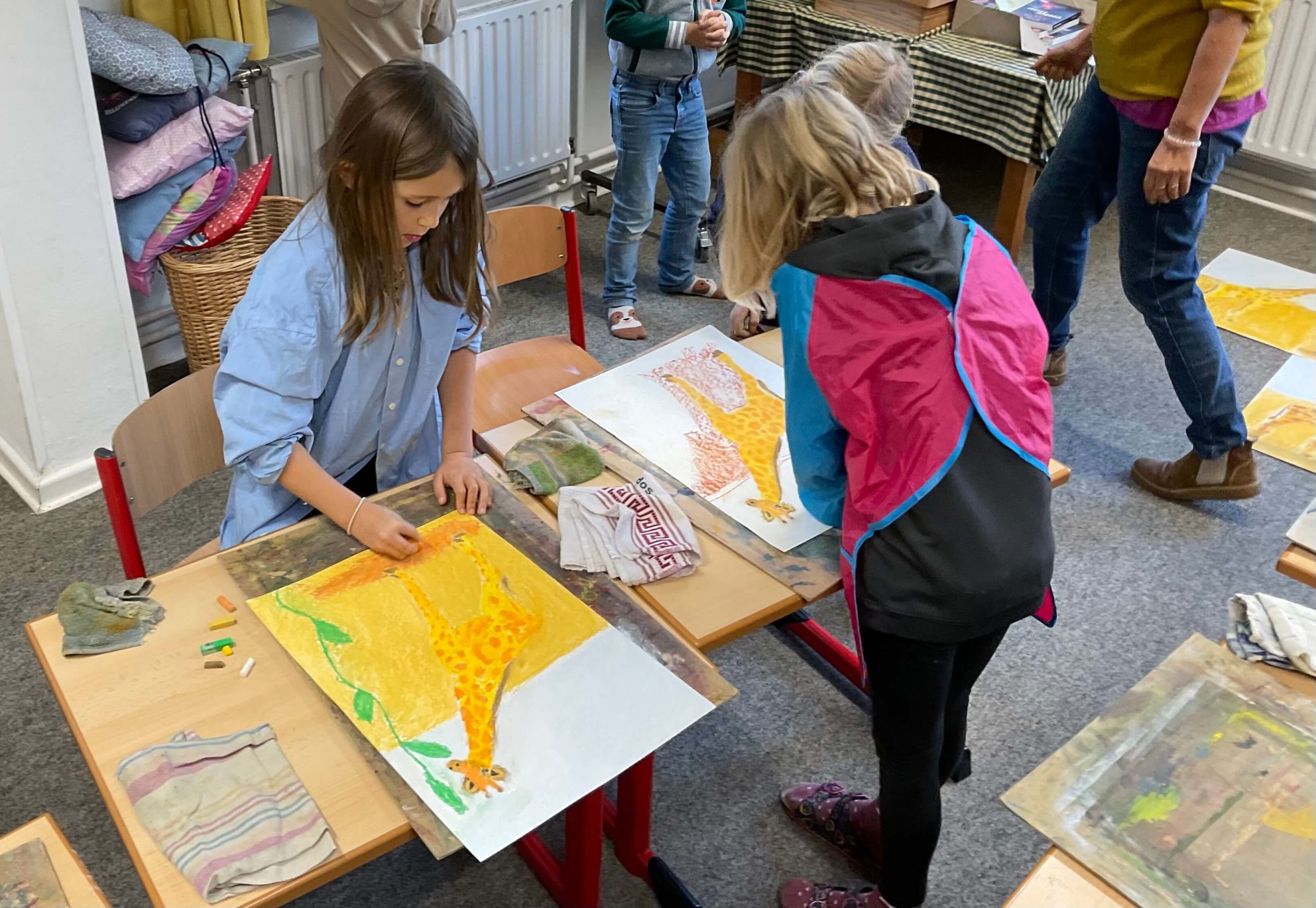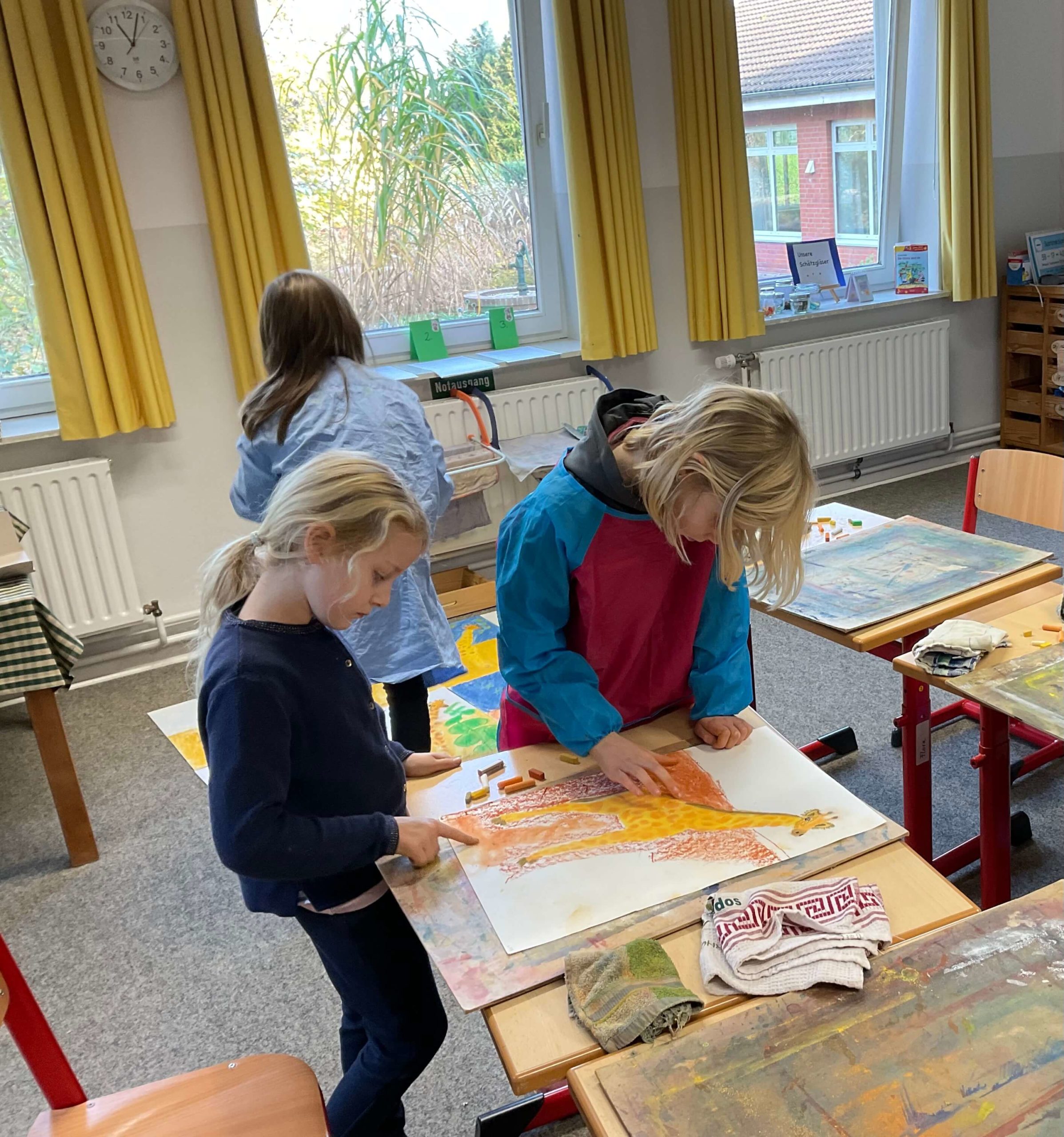 Am 13.11.2025 hatten die Kinder der Klasse 2c der Grundschule in Felm Besuch von der Kunstpädagogin Silvia Schrader vom Verein Natur & Kultur Carlshöhe aus Eckernförde. Gemeinsam lernten die Schülerinnen und Schüler das Farbspektrum und die verschiedenen Techniken von Kreidearbeiten kennen. Mit Pastellkreiden gestalteten die Kinder ihre Giraffe, die in der Symbolik für gewaltfreie Kommunikation, Empathie, Wertschätzung, Akzeptanz, Ruhe und Anmut steht. Wir danken Frau Schrader ganz herzlich für ihren Besuch!
